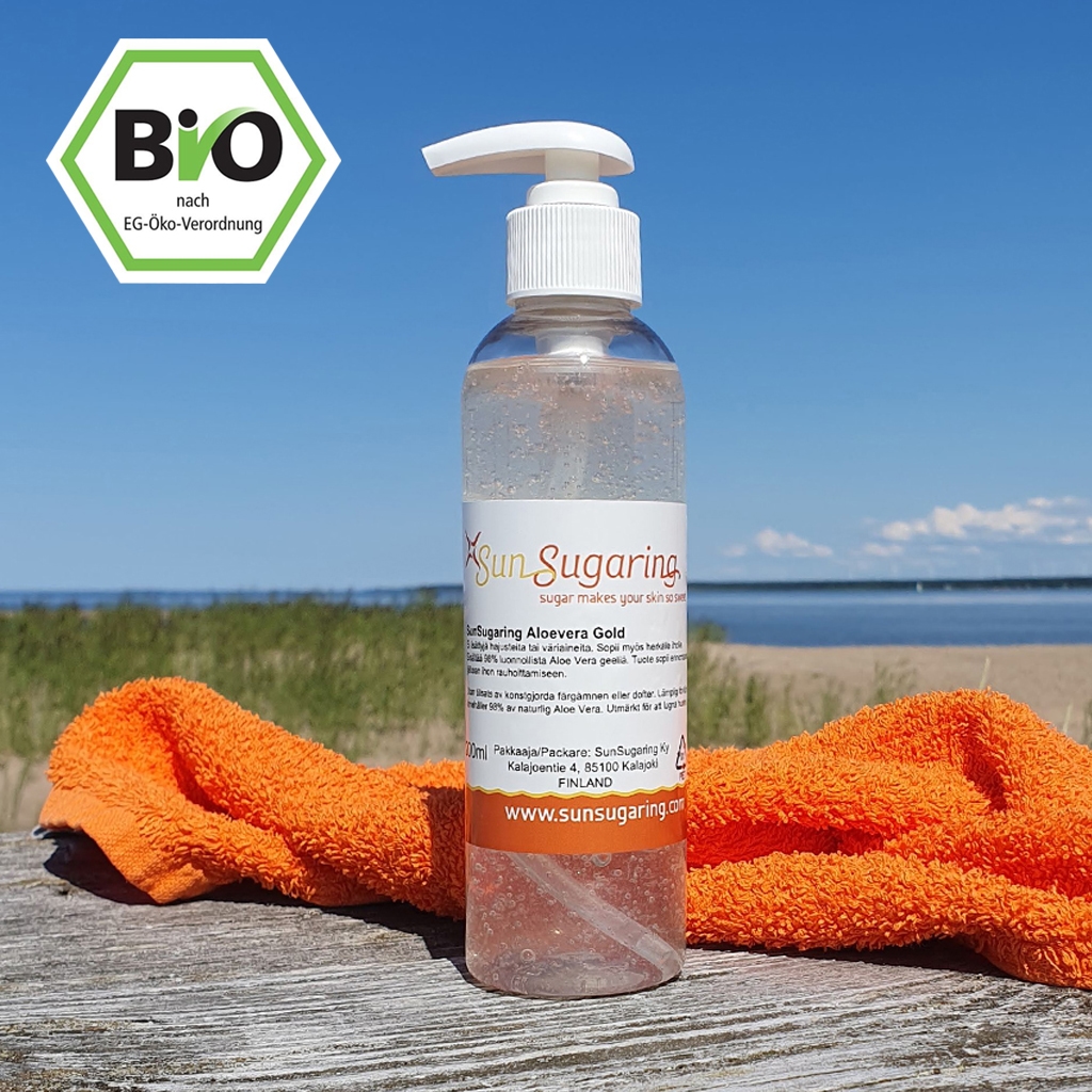 Sokeroinnin jälkeen levitä iholle SunSugaring aloevera geeli rauhoittamaan ihoa. Herkille ihoalueille kuten kasvot, kainalot ja bikini- ja brassialueelle aloeveraa on hyvä laittaa muutaman kerran vielä sokeroinnin jälkeen seuraavana päivänä.
